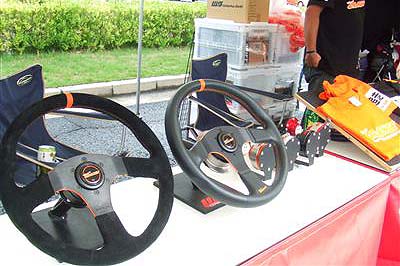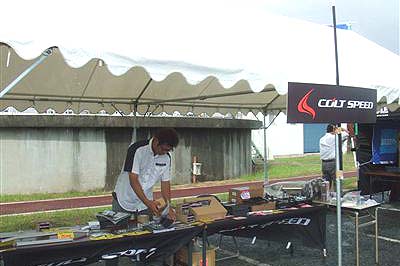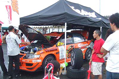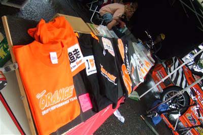 【上段左】 ダイヤモンドテクニック様のデモカーです。 【中段左】 熊久保信重選手率いるチームオレンジブース&デモカーです。 同じチームオレンジの田中選手との「ツインドリ」はD1の世界においては知らない人はいません^^昨年は総合優勝、今年はニューマシン縦置きエンジンのランエボに乗り換え、ノリノリのチームです。 派手なオレンジのTシャツ! ロゴはもちろん『アイラブ追走』です。 |
