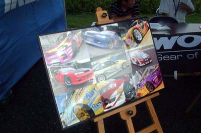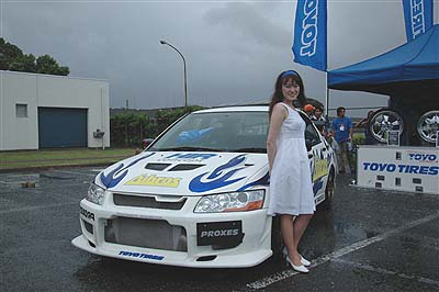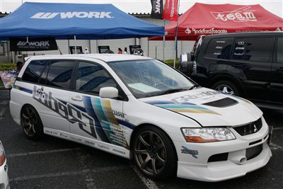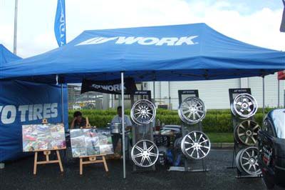 | 【上段左・右】 東洋タイヤ様のデモカーです。 癒し系のイベントガールも大人気でした。 【下段左・右】 ホイールで名高いWORK様です。 ドレスアップの足元はアルミから、お勧めです。 デモカーはランエボワゴンでした。 |