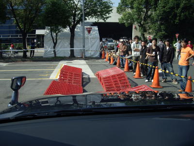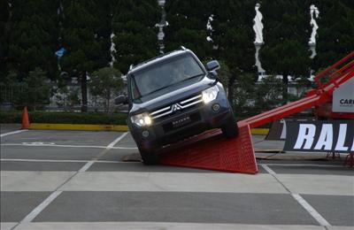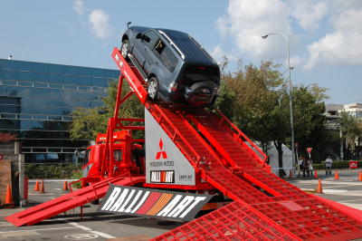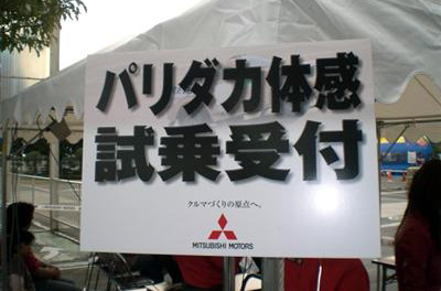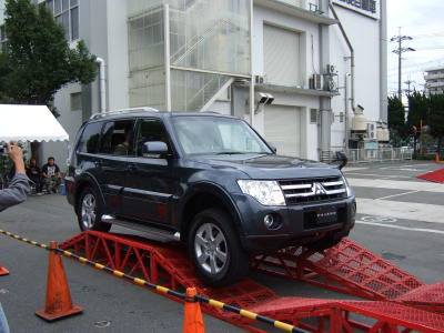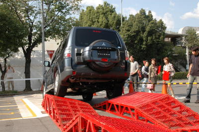 MMF京都の目玉イベントの一つ、新型パジェロに よるパリダカ体感です。当日の混乱を避けるため、 事前エントリーのみの受付です。競争倍率は2倍の 難関、幸運な90名の方に体感頂きました。 パリダカは世界一過酷と称されているオフロードの ラリーです。メインステージ西側に特設コースを設け プロドライバー(スーパー耐久レース等でご活躍の 小暮選手)運転による京都にいながらパリダカを体感 出来る企画です、最大45度の斜度の坂道、デコボコ 道、階段のぼりなどを体感頂きました。 【上段右・中段左】 わくわくしながら待つ当選者の皆さんです。 |